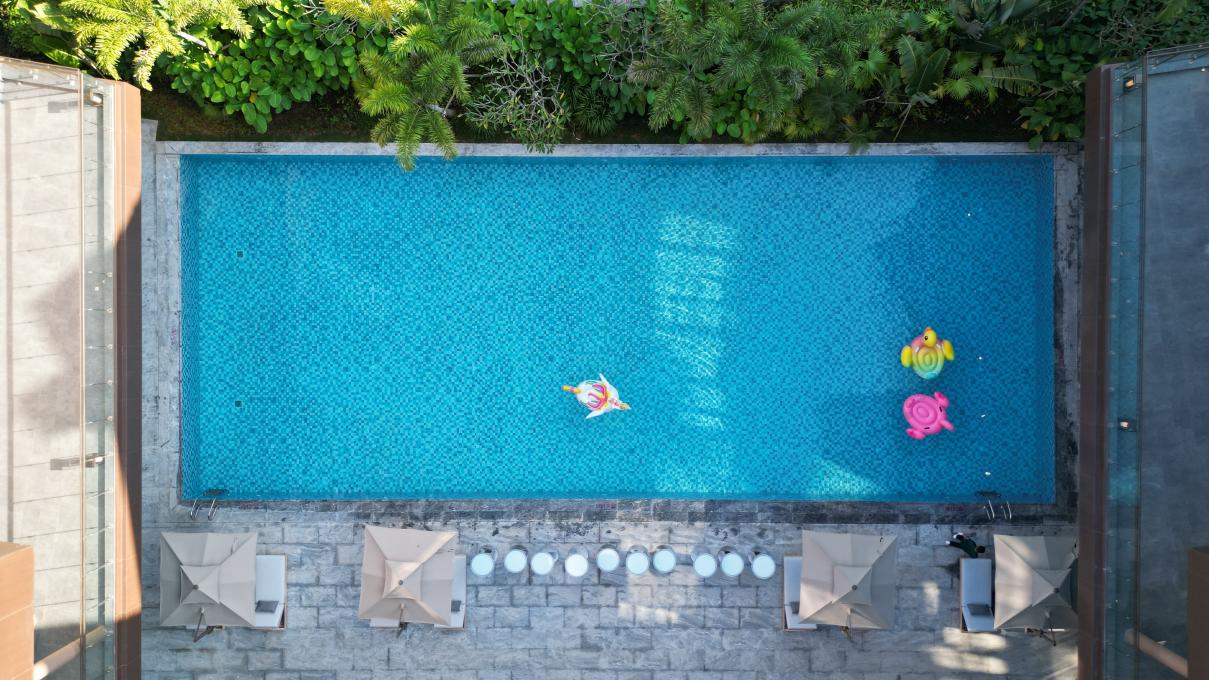 图为普洱景迈假日酒店泳池鸟瞰图 (2025年10月22日,朱翔 摄)