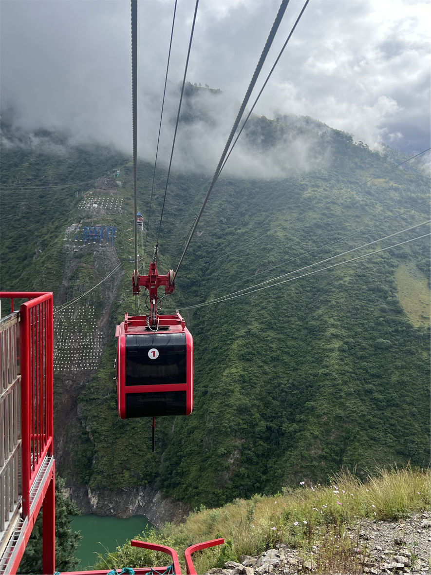 如今,理塘河特大桥已完成6个施工平台建设,运送施工人员的缆车3分半钟就能跨越河谷。