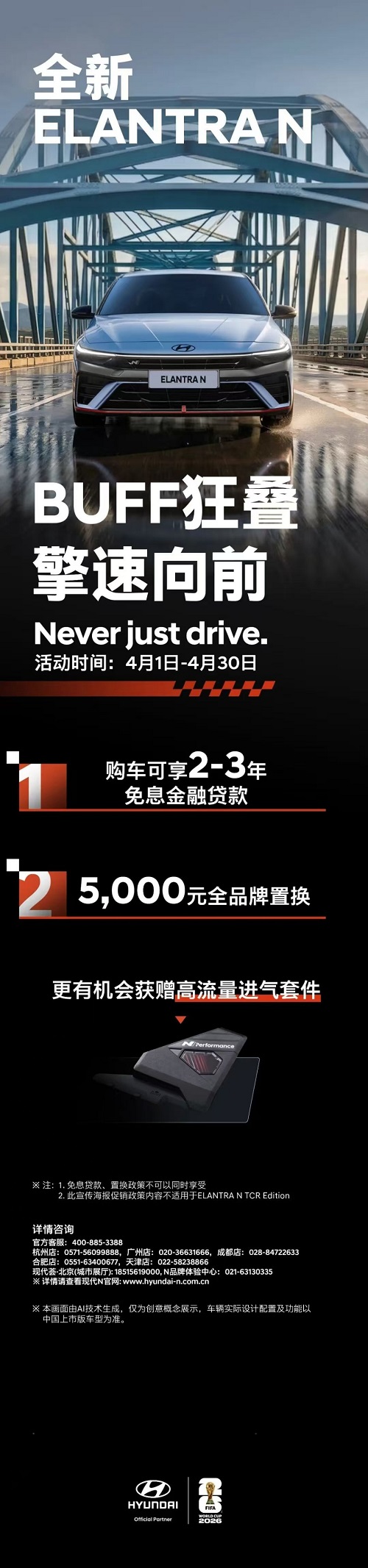 - 同时,现代汽车N品牌针对旗下车型推出2026年4月限时礼遇,活动时间为4月1日至4月30日。活动期间,下单Elantra N可享2-3年免息金融贷款,更有机会获赠高流量进气套件。同期,IONIQ 5 N(艾尼氪5N) 推出重磅限时礼遇,面向前20名支付尾款用户提供25000元专属购车优惠