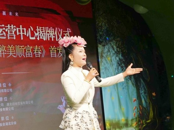 首发环节,著名青年歌唱家、曲作家马丽女士登台分享了《醉美顺富春》的创作来历与精神内核。这首由佟文西作词、马丽演唱的作品,以“顺富春”为精神内核,承载着“顺天应人、富而思源、造福社会”的企业价值观,将牛仔实业的质朴与楚台酱酒的醇厚融入旋律,唱出了企业的初心、家国的情怀与时代的担当。随后,马丽现场倾情演唱,天籁般的嗓音搭配真挚的情感,瞬间打动全场,将盛典氛围推向高潮。