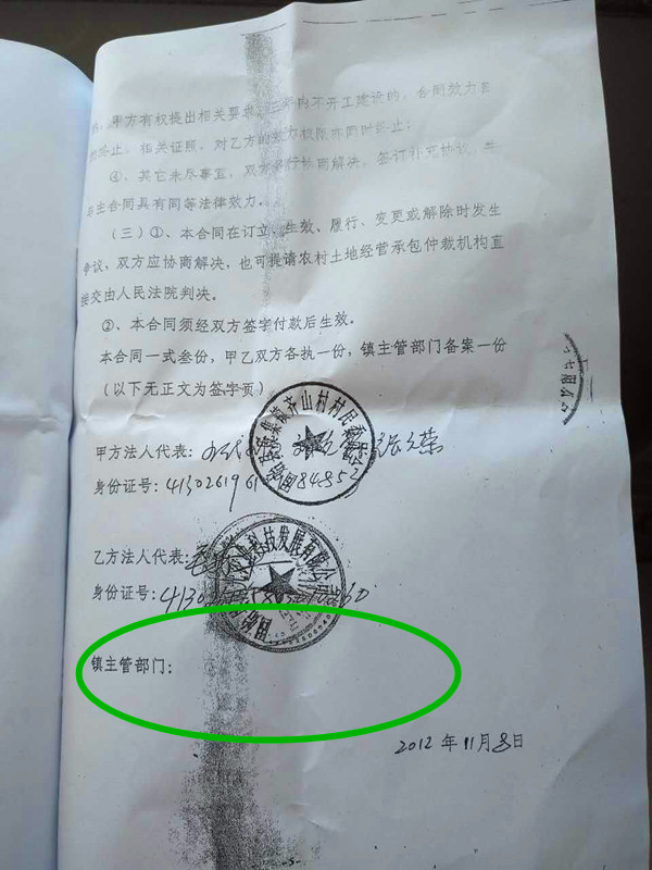 在齐山村委会和光农科技发展有限公司签订的协议里,只有齐山村与该公司的签名和盖章,“镇主管部门”却没有任何签字和公章。也就是说,齐山村10600亩山林被“贱卖”省、县、乡各级政府根本不知道,只是齐山村委会领导们,自己作主把10600亩山林以100万的价格卖给光农科技发展有限公司50年!