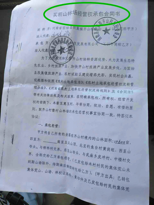 2012年固始段集镇齐山村民委员会与固始光农科技发展有限公司签署了一份协议,协议大体内容为,光农科技发展有限公司以100万元的价格买断齐山村10600亩山林50年经营权!