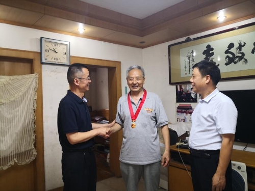 为避免老同志来回奔波,中心领导带领党员代表来到老党员家中进行慰问,为他们颁发“光荣在党50年”纪念章。仪式简朴而庄重。于勇谈到:在建党100周年的特殊历史时刻,党中央首次颁发“光荣在党50年”纪念章,既是对老党员的关爱关怀,也是对老党员的最高礼赞。希望老同志保重身体,继续为中心发展建言献策。抚摸着金灿灿的纪念章,老党员们深深感受到了党的温暖,表示今后将继续发扬优良传统和作风,传承红色基因,尽己所能,发挥余热。