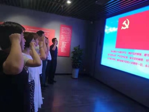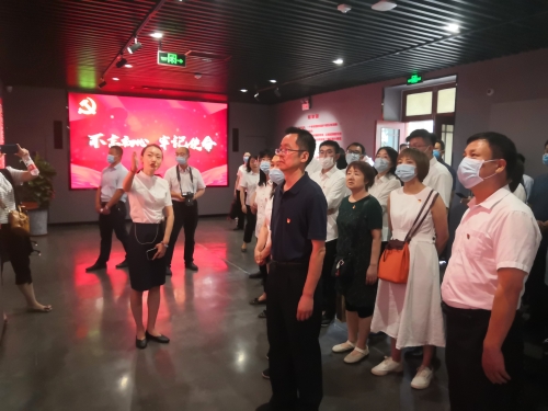 步入基地展馆,大家通过参观大量历史资料图片和听取有关讲解,了解了革命先烈作战、生活、生产的场面,感悟了那段血雨腥风的峥嵘岁月,接受了一次深刻的灵魂洗礼。1931年4月5日,在济南市纬八路国民党刑场、今省委党校西校区院内,中共一大代表邓恩铭等22位共产党员被国民党反动派杀害,史称“四五”烈士。基地主题展览《穿越时空的党课》,采用文字介绍、影像呈现、实物展陈等表现形式,集中展现山东早期党组织发展与斗争、烈士生平和英勇就义等内容。大家深深地为邓恩铭、刘谦初、郭隆真等“四五”烈士们坚守信仰、献身革命、不屈不挠、矢志不渝的革命精神所感动。最后,全体党员面向党旗,庄严地同举右手,在中心书记于勇的领誓下进行了重温入党誓词宣誓活动。铮铮誓言,体现了党员同志们对中国共产党的无限忠诚,坚定了入党使命,奋斗初心。