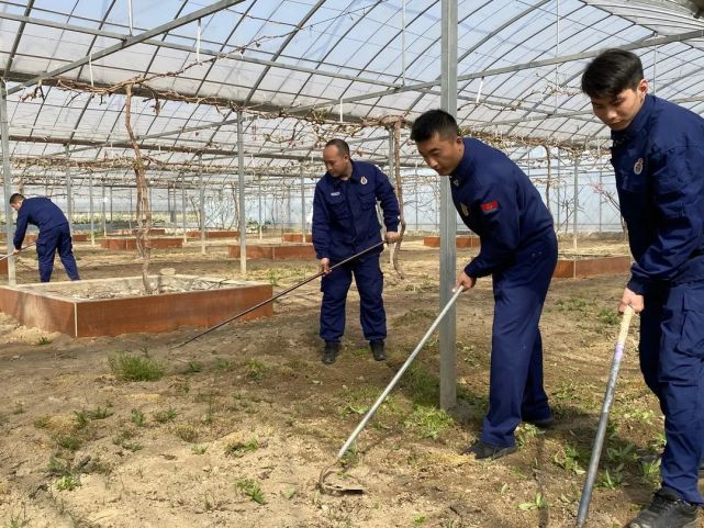 南通市消防救援支队开展学雷锋志愿服务活动,指战员们在“葡萄架下党旗扬”党建阵地中同工人们一同除草、抹芽。