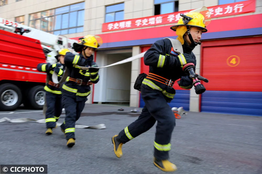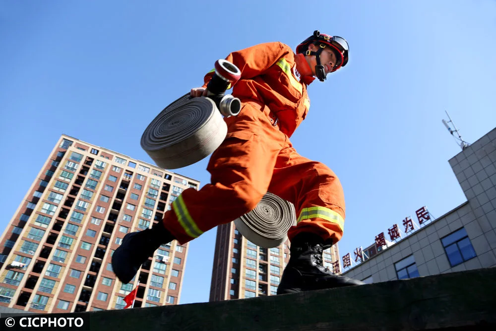 ↑2021年12月2日,江苏省连云港市连云区消防救援大队的消防员在进行灭火作战训练。CICPHOTO/王春 摄
