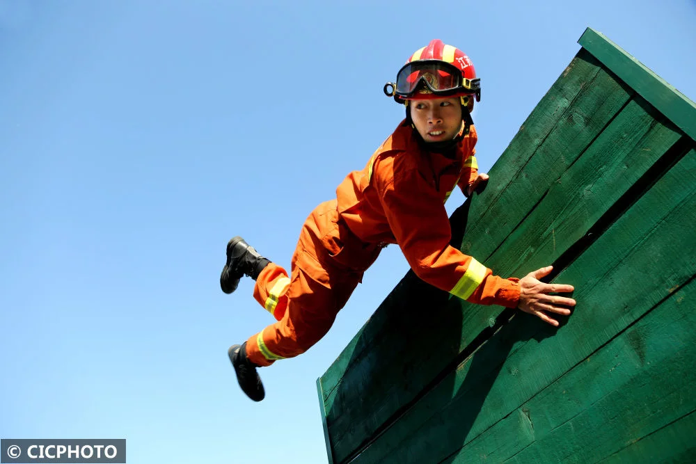 ↑2021年12月2日,江苏省连云港市连云区消防救援大队的消防员在进行快速跨越障碍训练。CICPHOTO/王春 摄