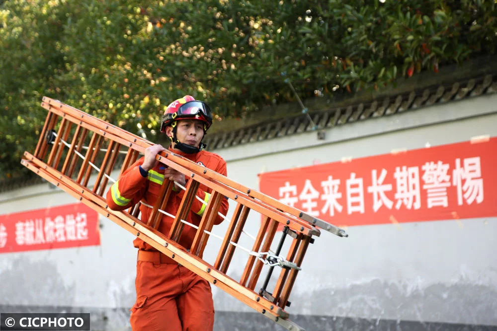 ↑2021年12月2日,江苏省连云港市连云区消防救援大队的消防员在进行救援攀爬训练。CICPHOTO/王春 摄