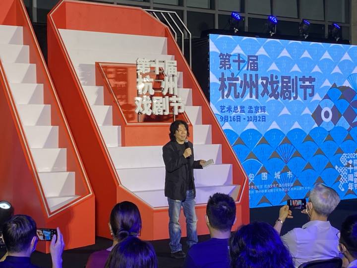 9月16日晚,在良渚文化艺术中心,一个阶梯状的超大数字“10”伫立在舞台正中,伴随着倒计时,由中共杭州市委宣传部、杭州文化广播电视集团主办,杭州演艺集团、杭州蜂巢戏剧文化有限公司、杭州话剧艺术中心承办,大屋顶文化协办,孟京辉担任艺术总监的2021杭州戏剧节正式开幕。